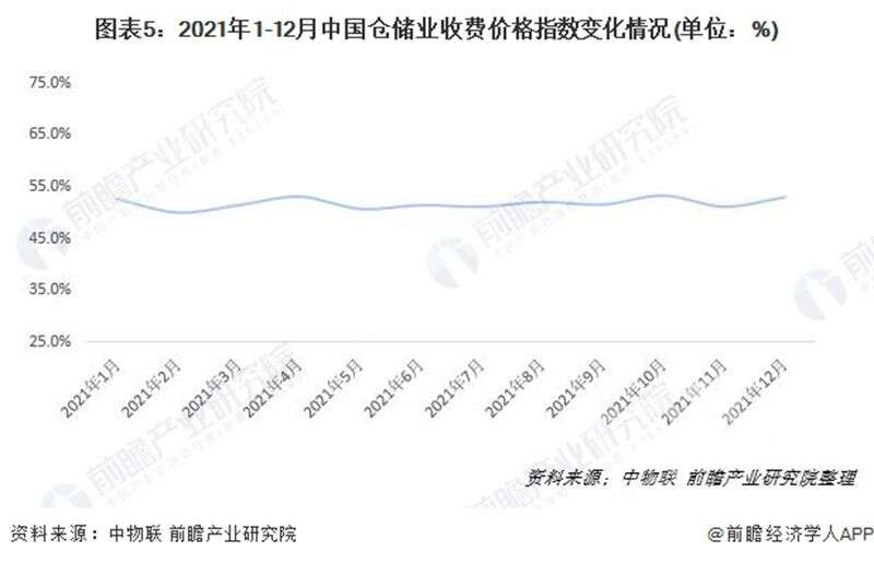 2021年,收費價格指數均值為51.7%,高于2020年1.6個百分點,指數連續(xù)十六個月未落入榮枯線以下,表明倉儲業(yè)務收費價格保持上升勢頭。