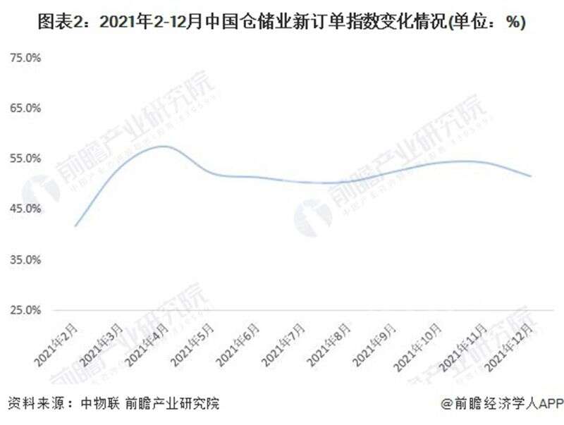從中物聯(lián)發(fā)布的中國倉儲指數中的新訂單指數變化情況來看,2021年2-12月中國倉儲業(yè)新訂單指數均值為51.8%,同比下降0.4個百分點;顯示出倉儲行業(yè)受新冠疫情、全球經濟下行等因素影響導致行業(yè)需求整體趨弱。