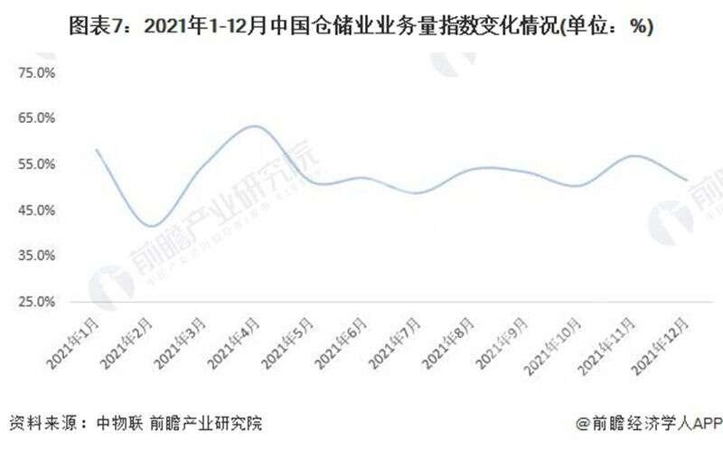 根據中國物流與采購聯(lián)合數據,2021年1-12月,中國倉儲業(yè)務量指數均值為53.1%,同比增長0.7%,整體位于枯榮線(50%)以上,反映出倉儲行業(yè)需求在企業(yè)生產活動加快和消費品需求保持回升的背景下,仍保持較為穩(wěn)定的態(tài)勢。