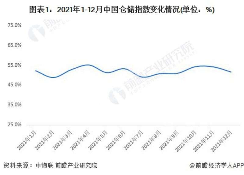 2021年1-12月,中國倉儲指數均值為52.0%,較2020年增長1.1個百分點,整體位于50%以上的擴張區(qū)間內,顯示倉儲行業(yè)運行穩(wěn)定。年末消費品受節(jié)日因素和電商活動提振,業(yè)務需求較為旺盛;部分大宗商品受冬儲需求增強影響,整體庫存水平繼續(xù)提高。需求增加令倉儲市場租金有所上漲,收費價格指數保持增長。后期來看,受嚴寒天氣持續(xù)以及春節(jié)臨近等因素影響,建筑業(yè)景氣回落,大宗商品將進入傳統(tǒng)需求淡季,加之終端市場需求趨弱,預期后期行業(yè)運行壓力或將有所加大。
